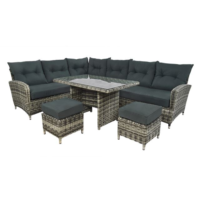 set divan me dy pupa dhe nje tavoline me perberje ratani dhe viker te peshtatshem per AMbjent te jashtem Kendi Dimensionet 270x210x80 cm Dimensionet e tavolines: 120x75x66 cm
